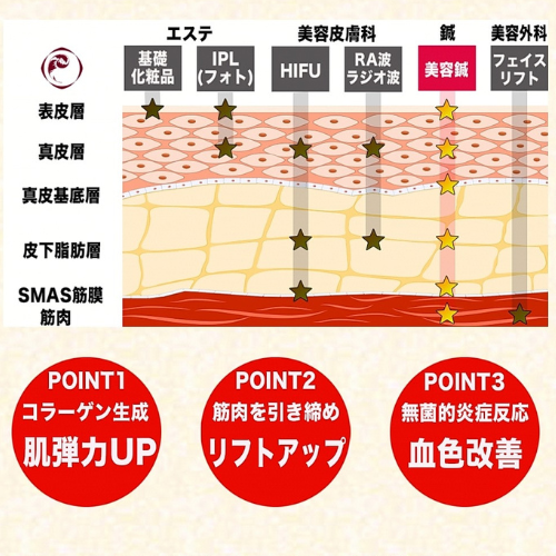 鍼を刺すことによりマイクロカレント(微小損傷)を作り、その治癒過程で真皮層のコラーゲンやエラスチンという肌のハリやたるみに関わる繊維芽細胞を活性化させ、コラーゲンやエラスチンの産生が増えることでリフトアップ、肌の弾力UP、しわ改善に繋がります。