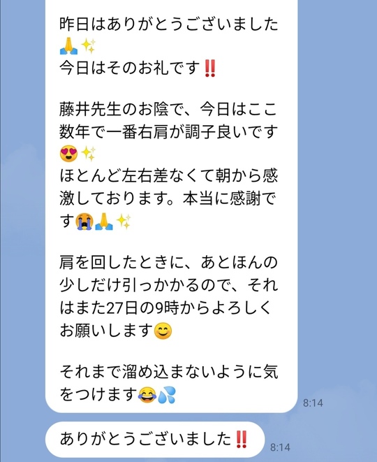 症状以外にも、夜勤による自律神経の乱れや食いしばりの調整をしたことで症状が緩和されたみたいです。