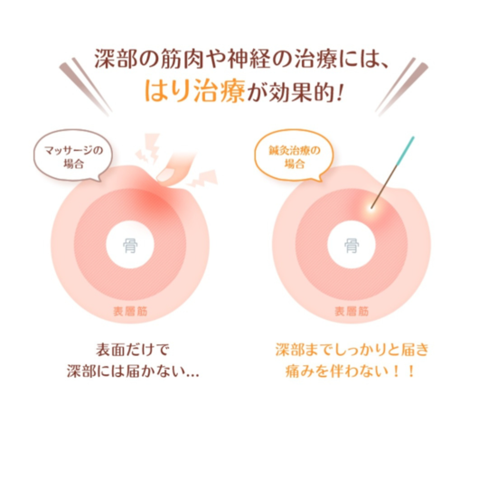 しかし、鍼であれば最小の刺激でそのまま深部まで届きます。まわりに無駄な刺激を与えることもありません。